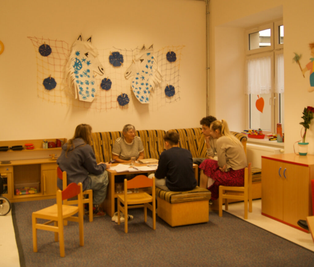 11.-18. října 1986, Vysoké nad Jizerou. Paní Hořínková uprostřed fotografie v brýlích