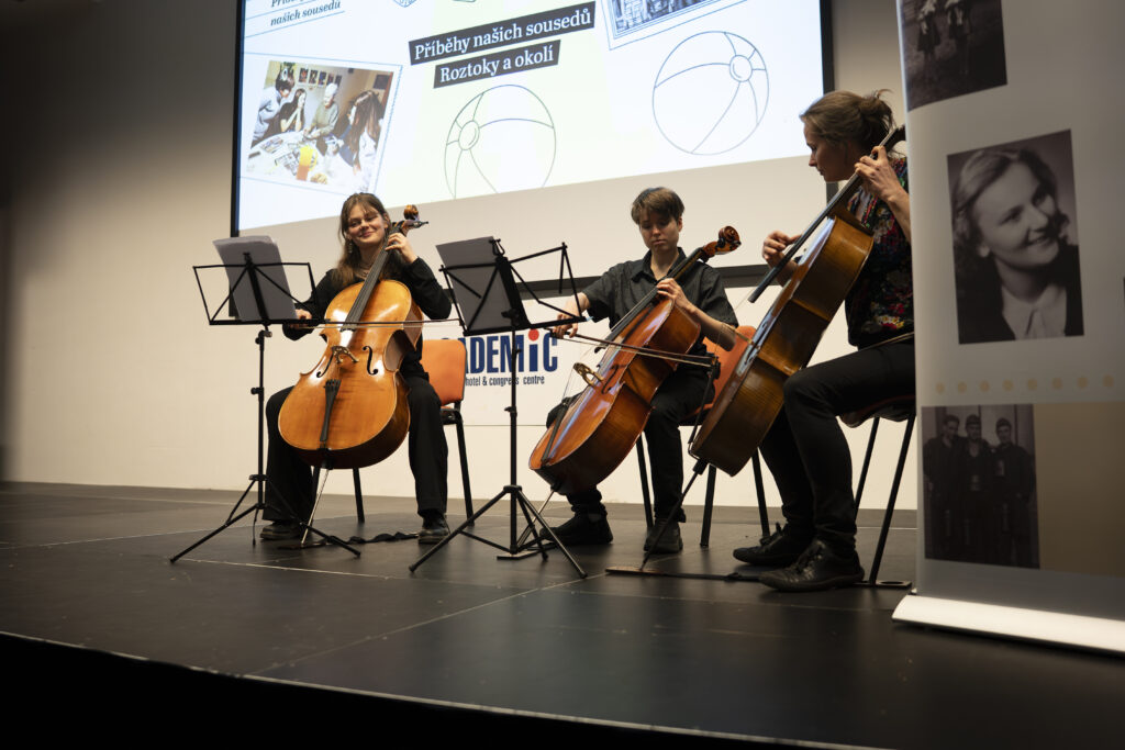 Hudební doprovod zajistilo violoncellové trio ze ZUŠ Roztoky pod vedením Marie Součkové, které zahrálo na začátku a uprostřed programu a dodalo celému odpoledni slavnostní ráz. Samotné prezentace byly velmi různorodé a nápadité. Po každém vystoupení následovalo promítnutí výstupu daného týmu – zazněly tři audioreportáže, diváci zhlédli tři animace a jednu videoreportáž. Všechny práce byly pečlivě zpracované a bylo zřejmé, kolik úsilí a času do nich žáci vložili. Jeden z týmů dokonce obohatil svou prezentaci o divadelní scénku, která přiblížila klíčové momenty ze života jejich pamětníka.